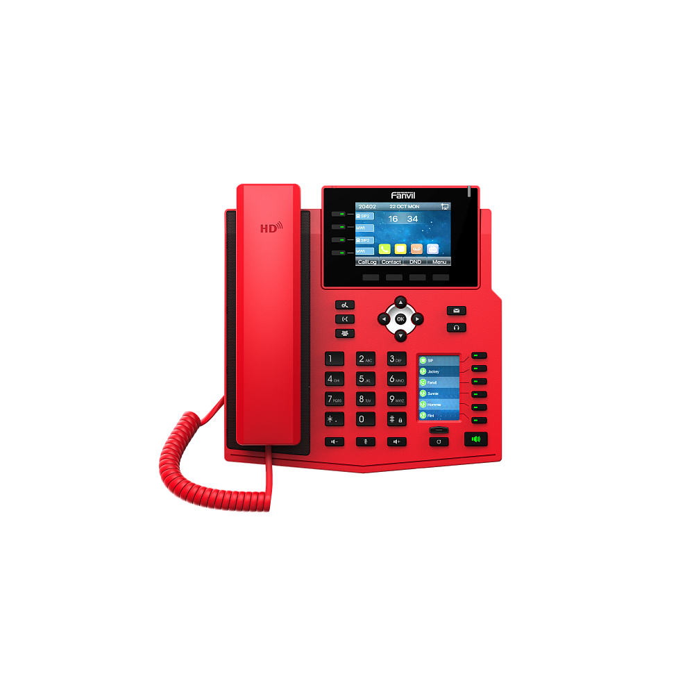 Fanvil X5U — специальный красный IP-телефон, заметный издалека. Создан для работы в службах скорой помощи, пожарных станциях, МЧС и других местах, где средство связи должно выделяться. HD-звук с динамиком Harman, кодеки G.722 и Opus. Два цветных дисплея, 30 DSS-клавиш, запись разговоров на USB, 16 SIP-линий, встроенный Bluetooth, WiFi через адаптер, поддержка PoE, 2 порта Gigabit. Аналог Fanvil X5U в ярком цвете.