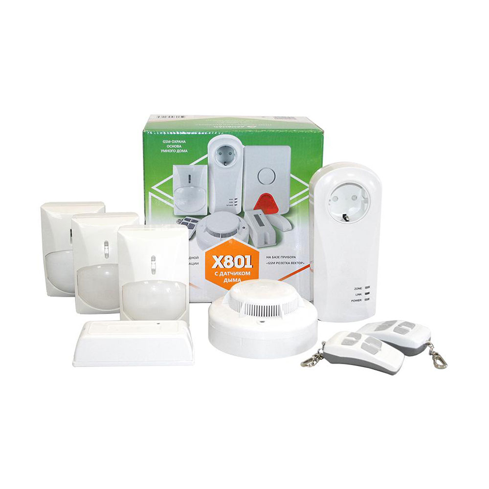 Комплект охранной сигнализации «Сибирский Арсенал» X-801 состоит из контрольного прибора «GSM-розетка Вектор», двух радиобрелоков управления Б4 Р, трех инфракрасных датчиков движения «Оптимист-Р», датчика открывания «ВС-СМК Вектор» и датчика дыма со звуковым оповещателем ИП212-230Р «ДИП-230Р Вектор».