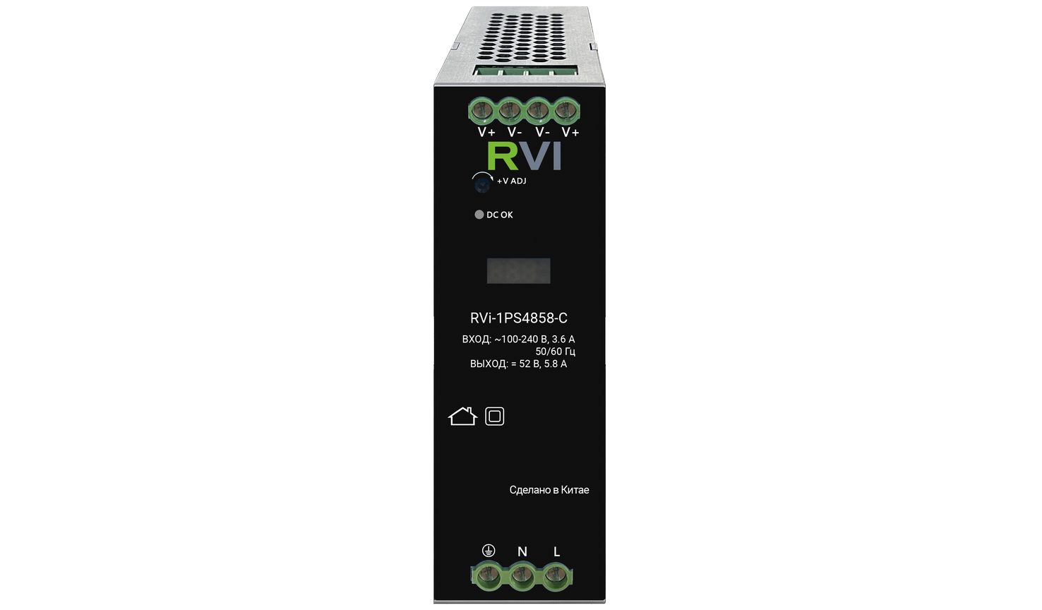Источник питания модели RVi-1PS4858-C предназначен для установки на DIN-рейку. Он характеризуется номинальной выходной мощностью 300 Вт и оснащён функцией регулировки выходного напряжения. Устройство также обладает системами защиты от перегрева, перегрузки и короткого замыкания. Рабочий температурный диапазон источника питания составляет от -40 до +50 °С.
