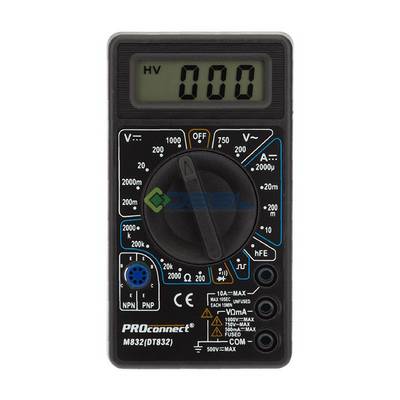 Портативный цифровой мультиметр PROconnect M838 (DT838) измеряет сопротивление, напряжение AC и DC, силу DC, температуру, проверяет целостность цепи, тестирует диоды и транзисторы (PNP, NPN). Построен на базе аналого-цифровом преобразователя двойного интегрирования, оснащен 3.5-разрядным жидкокристаллическим дисплеем и температурным датчиком К-типа TP-01.
