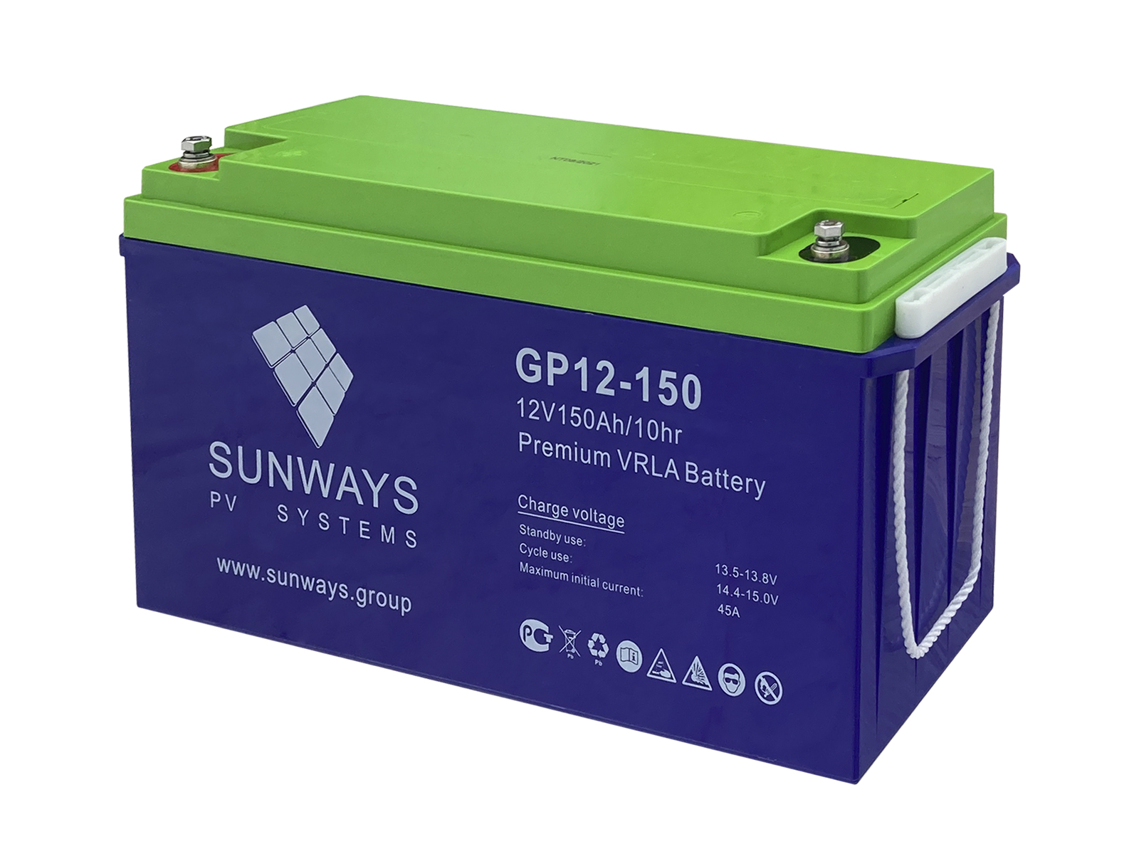 Аккумуляторные батареи Sunways серии GP являются универсальными и предназначены для работы в охранных, пожарных, солнечных энергосистемах, системах бесперебойного питания и ветрогенераторных установках. Корпус таких батарей полностью герметичен и выполнен из негорючего ABS пластика, что исключает возможность выделения кислотных паров и водорода. Это позволяет отнести батареи к необслуживаемым и эксплуатировать их внутри жилых и офисных помещений. При производстве аккумуляторов применена технология AGM (Absorbed Glass Mat). Они предназначены для работы как в циклическом, так и буферном режиме. Аккумуляторные батареи серии GP – одно из лучших предложений на рынке благодаря продолжительному сроку службы (10 - 12 лет), улучшенным зарядным характеристикам, абсолютной герметизации корпуса и доступной цене.